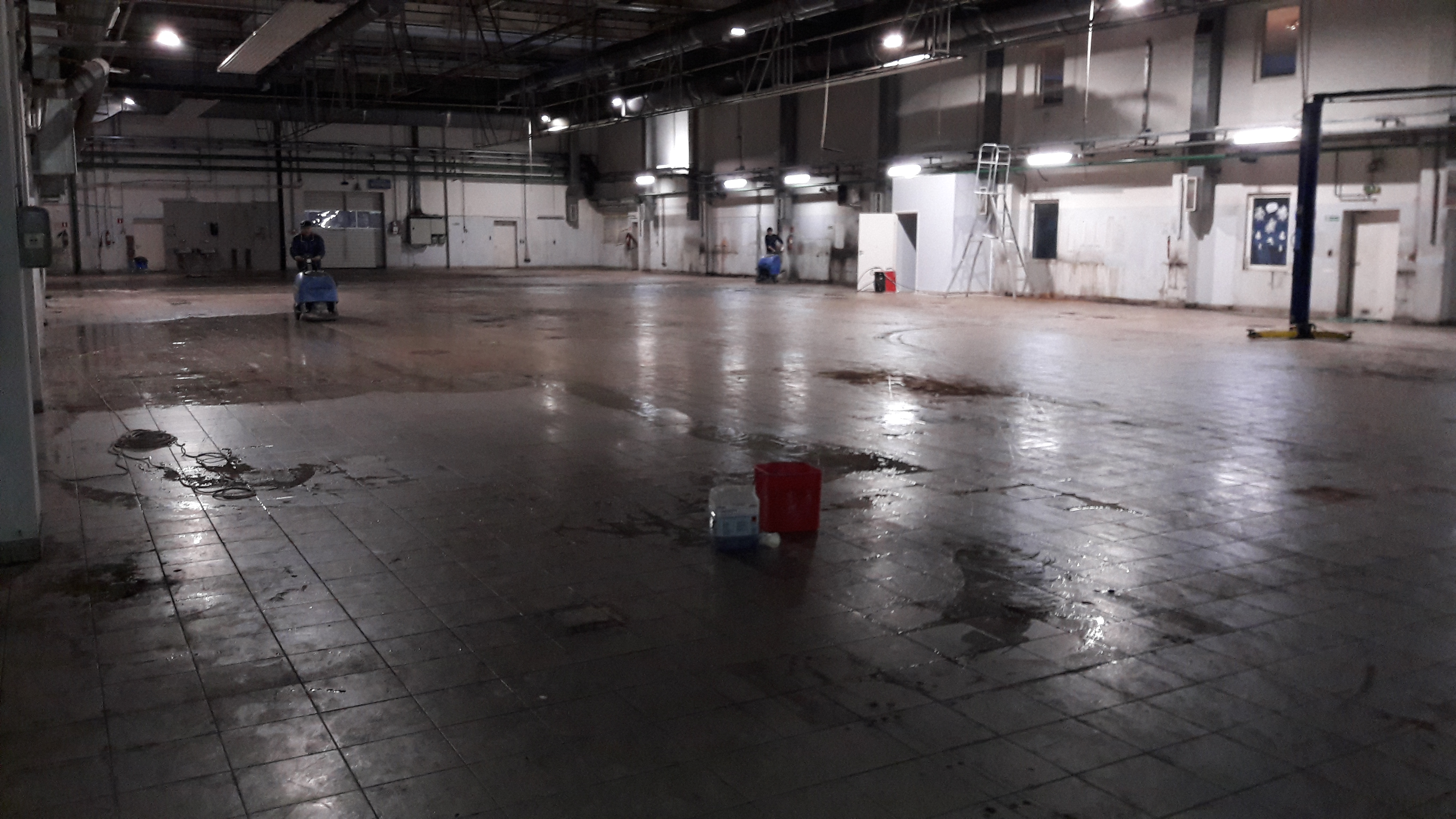 Произведена генеральная уборка производственных помещений мясоперерабатывающего комбината, в т. ч. обезжиривание стен, потолков, полов, технологического оборудования.
