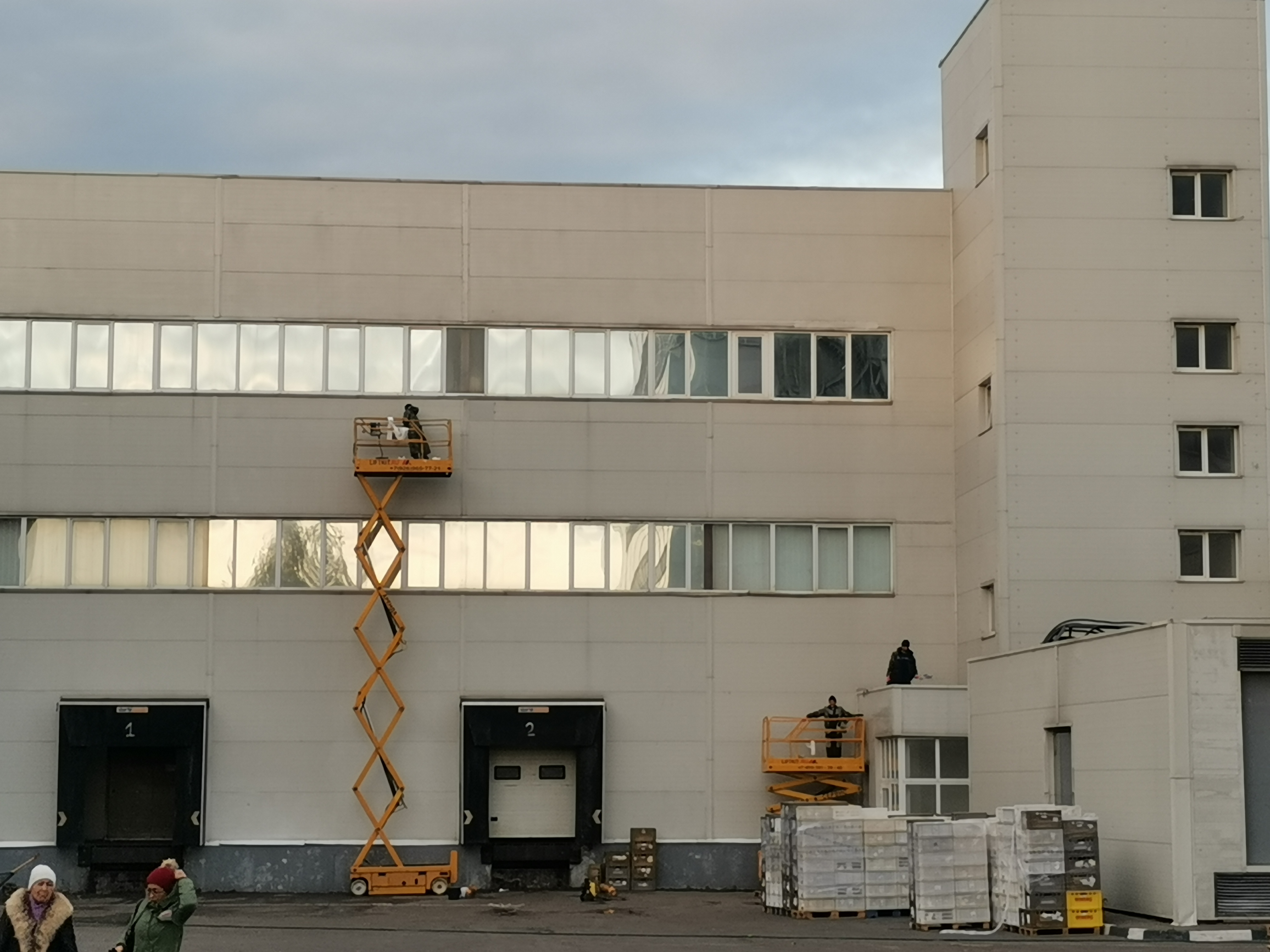 Произведено мытье фасадных и оконных конструкций производственных зданий (высота - 16 м и 24 м) с применением химических средств.