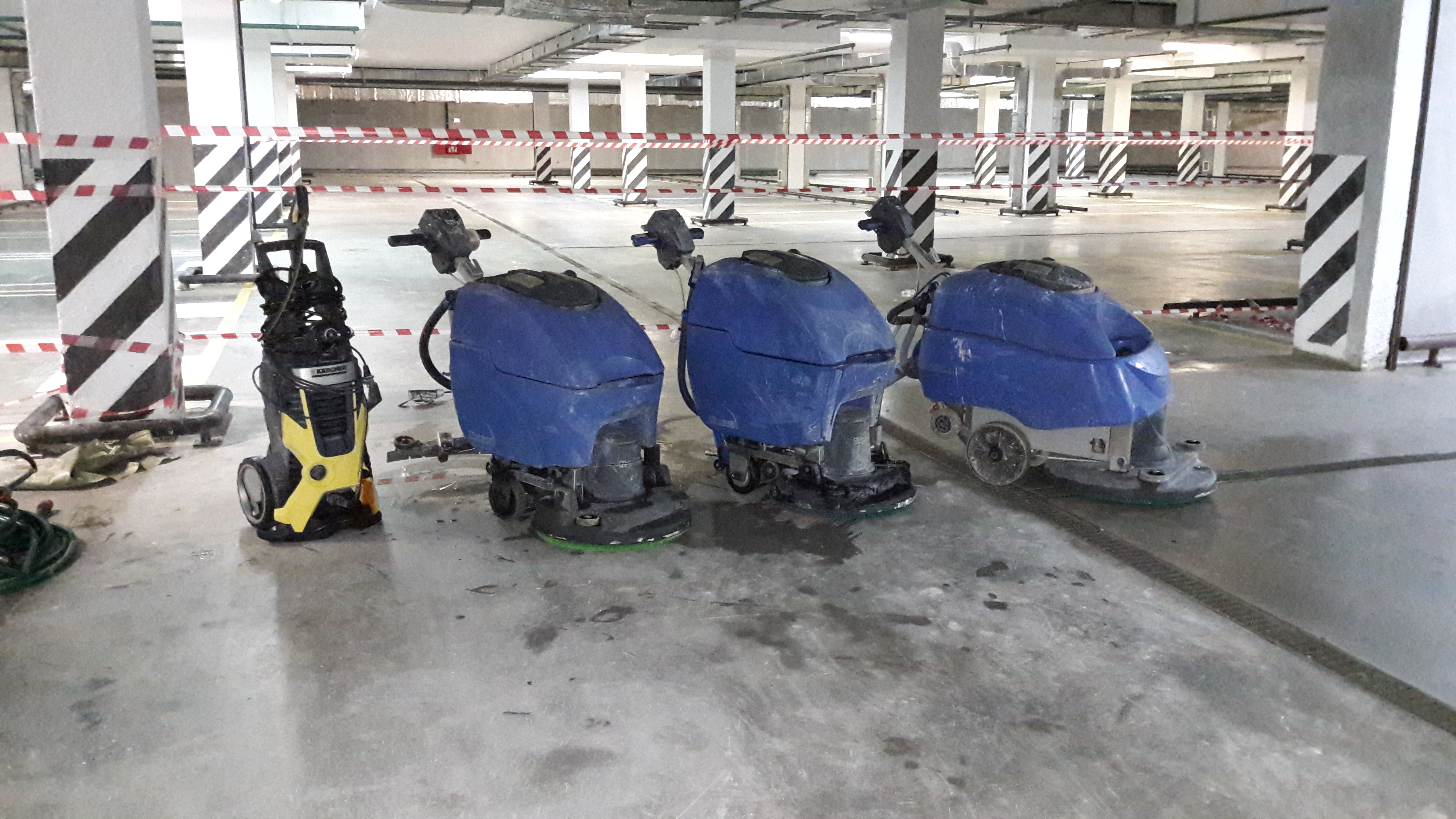 Использовались сетевые поломоечные машины с абразивными размывочными кругами, аппарат высокого давления для мытья труднодоступных мест, специальные химические средства.